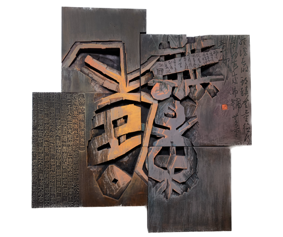 《无量寿》刻字作品,创作于2023年,在构思上试图打破传统刻字的规整形式,以独特的布局营造视觉张力。将“无量寿”三字进行解构与重构,笔画相互穿插、错落,让文字在打破常规中又保持内在的和谐统一,以此传达出一种深邃、超脱的意境。