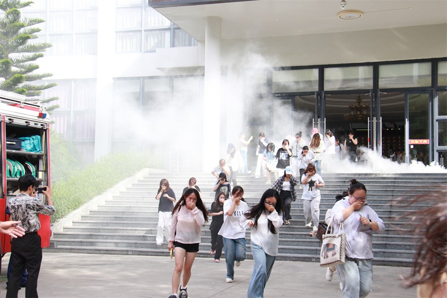 随后,图书馆消防疏散演练拉开帷幕。美术学院学生代表在图书馆、保卫处工作人员的引导下,用湿毛巾捂住口鼻,弯腰低姿,按照预定疏散路线,从图书馆阅读室迅速、有序地疏散至图书馆北门前。整个演练过程紧张有序,学生们动作规范,展现出良好的应急反应能力,达到了预期的演练效果。