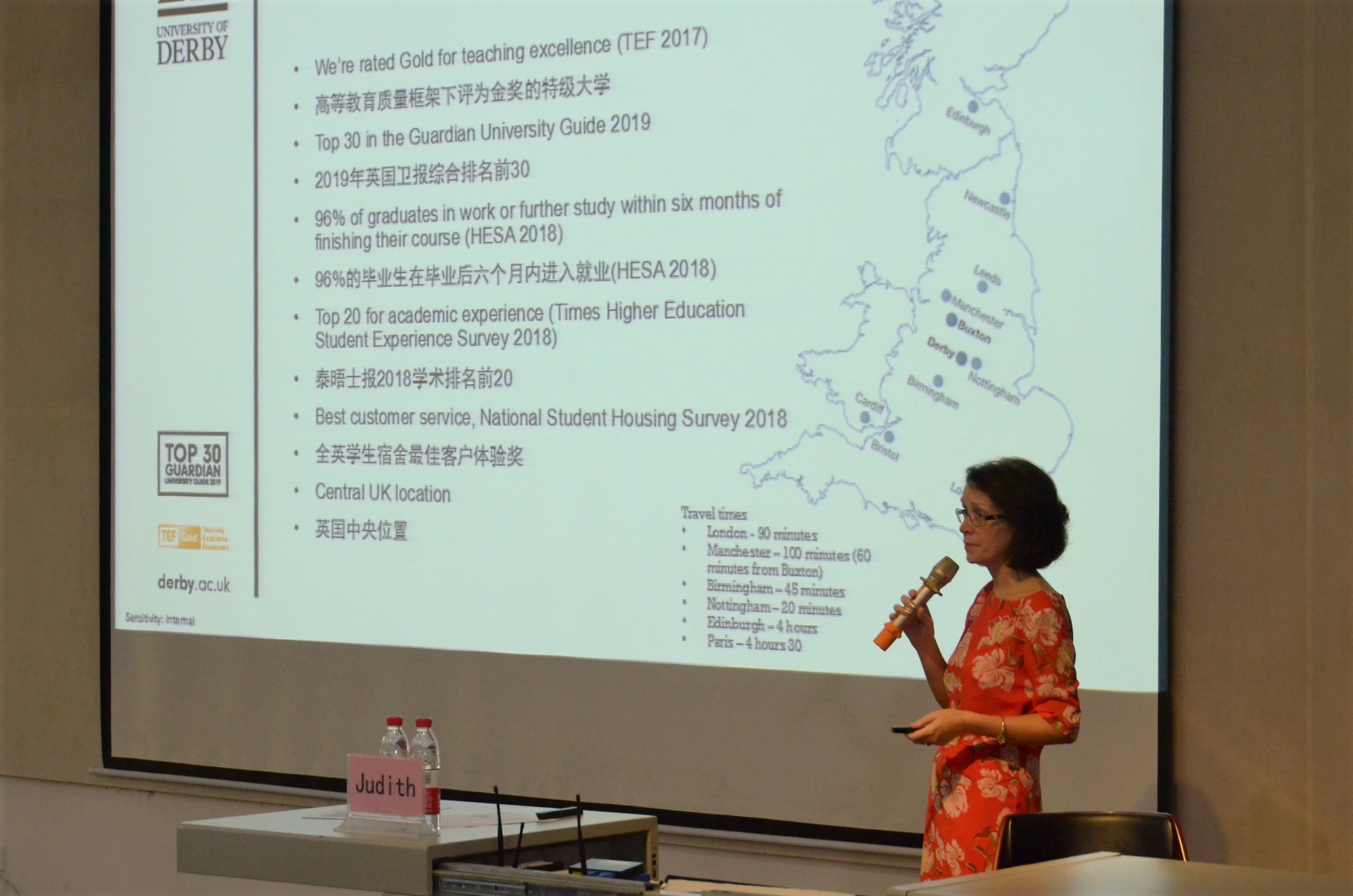 伴随着热烈的掌声,Judith常务副校长向大家带来诚挚的问候。她首先介绍了德比大学位于文化历史遗产丰富的德比郡,周边有国家公园和游乐场等设施。而后依次介绍了教育学院、商学院、自然科学学院、工程学院等,各个学院都获得过良好的成绩。学校开展校企合作使其就业率达到96%,给学生更好的提供了实习机会发展空间,让学生寻找更广阔的舞台。