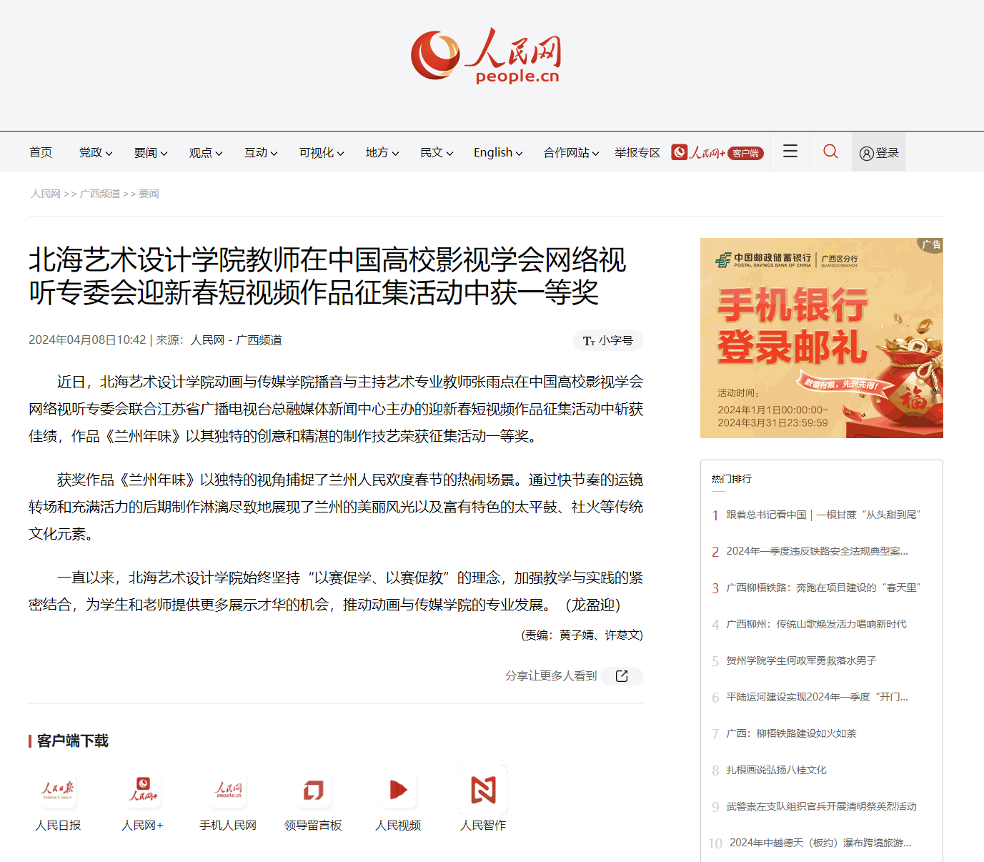 人民网:北海艺术设计学院教师在中国高校影视学会网络视听专委会迎新春短视频作品征集活动中获一等奖
