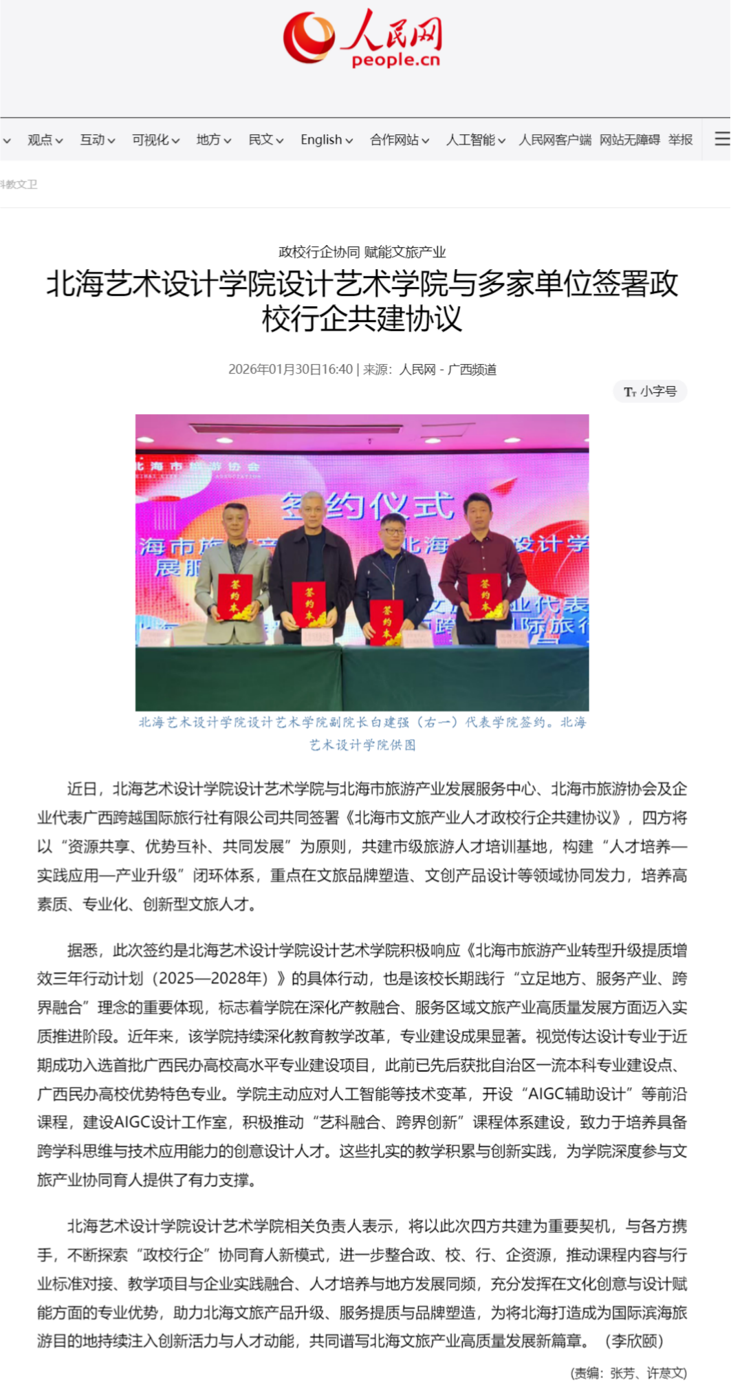 人民网:政校行企协同 赋能文旅产业——北海艺术设计学院设计艺术学院与多家单位签署政校行企共建协议