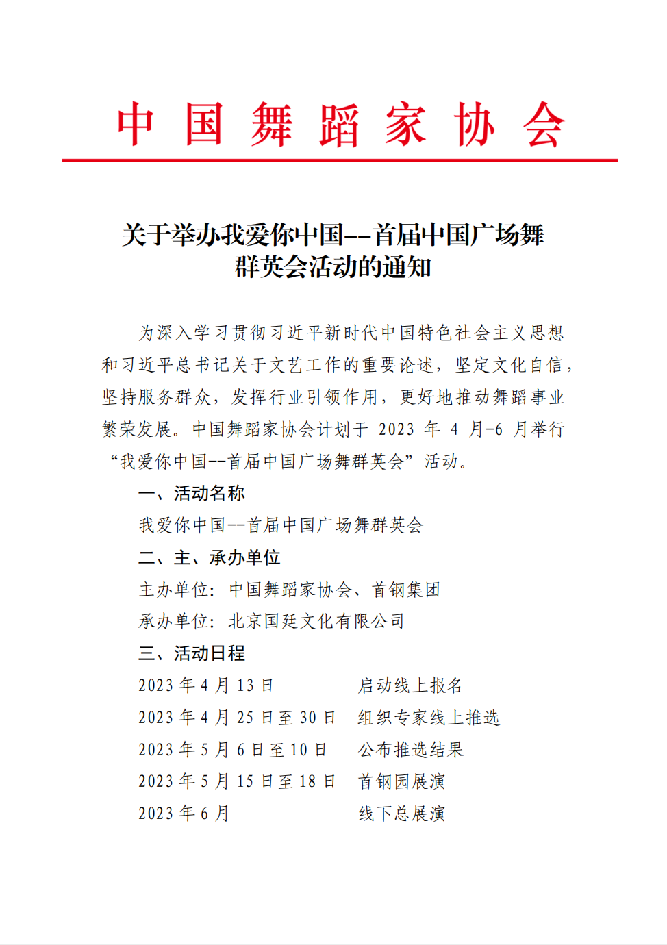 关于举办我爱你中国--首届中国广场舞群英会活动的通知