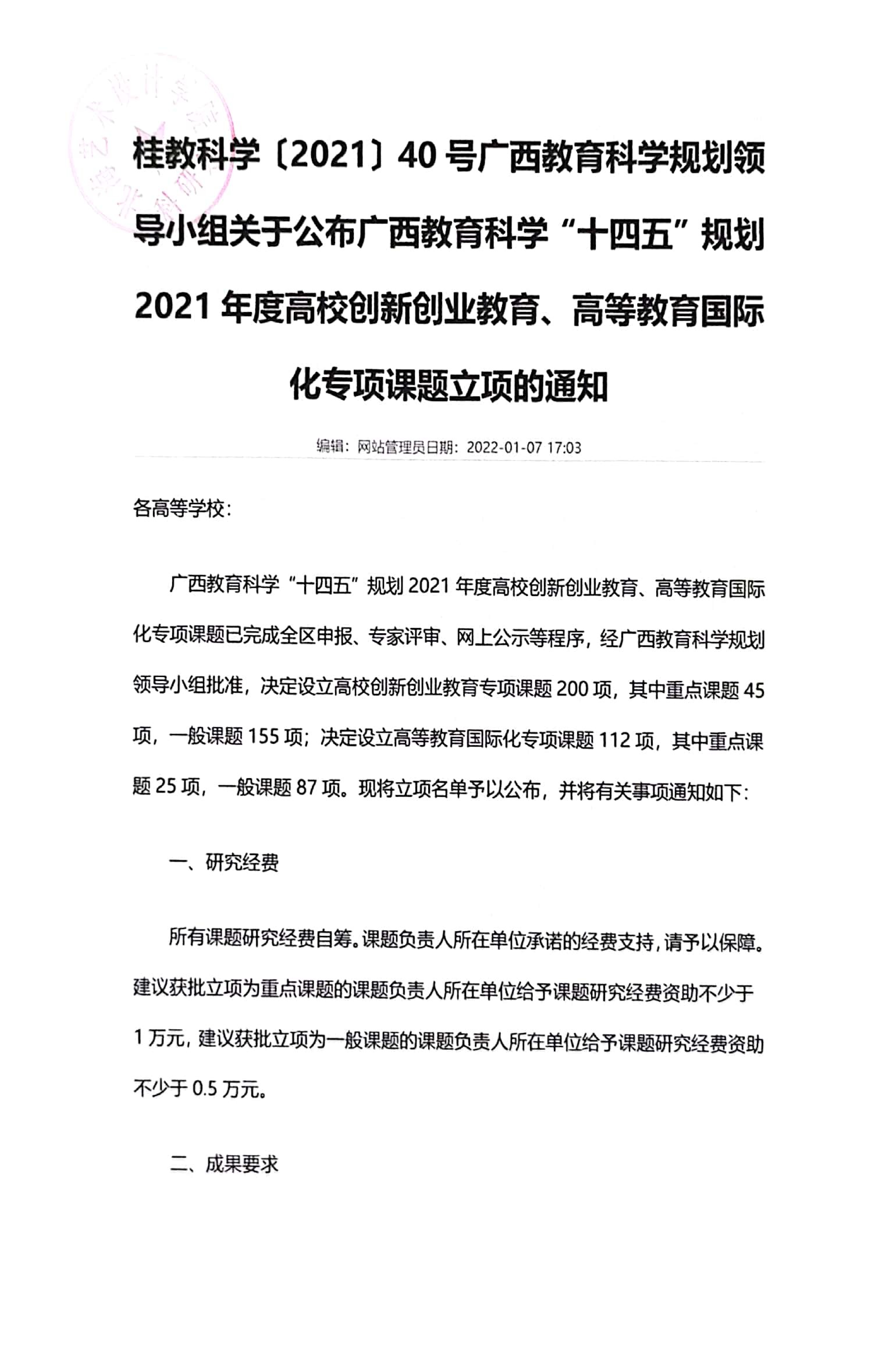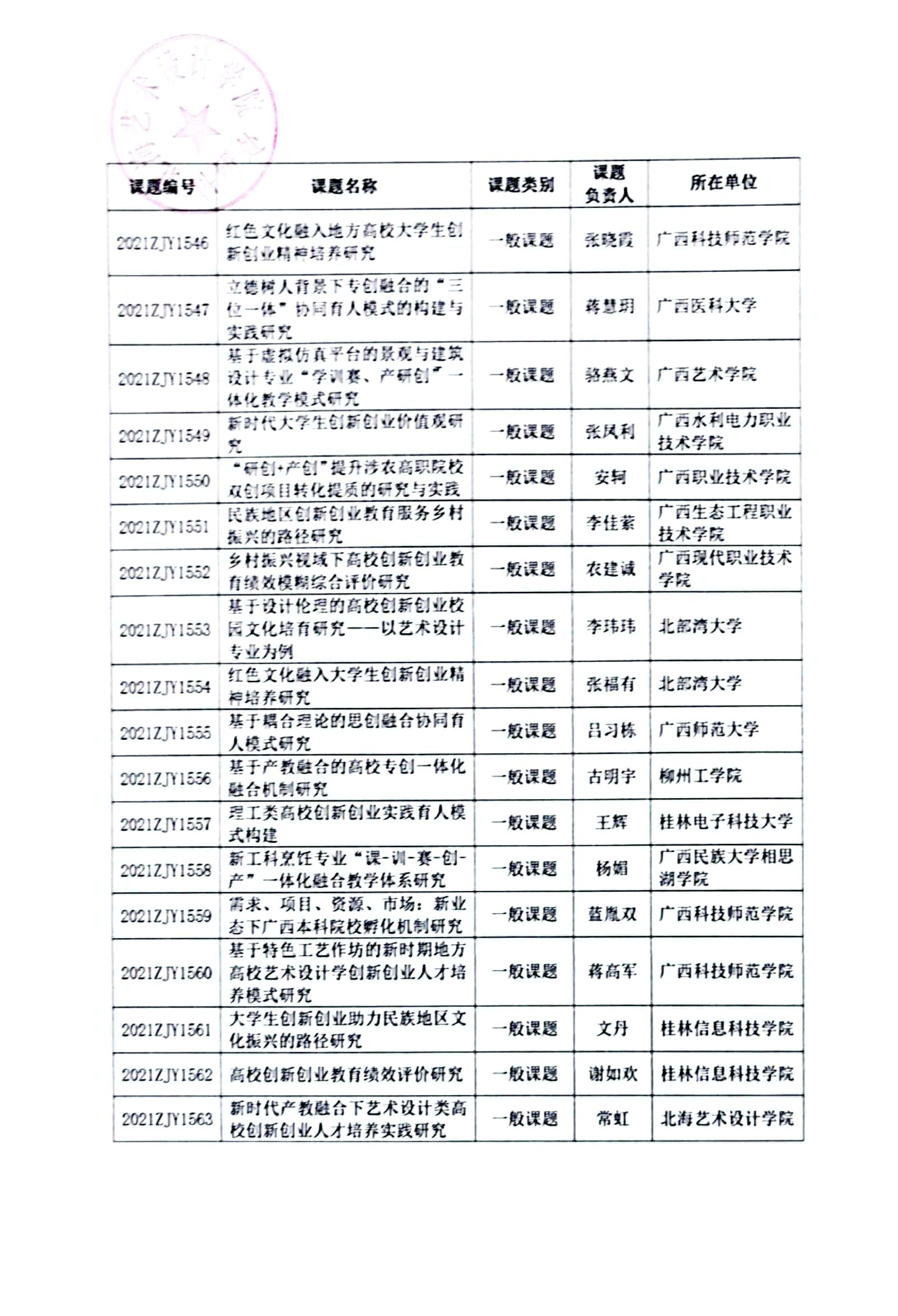 2021年“十四五”规划高校创新创业教育、高等教育国家化专项课题立项通知