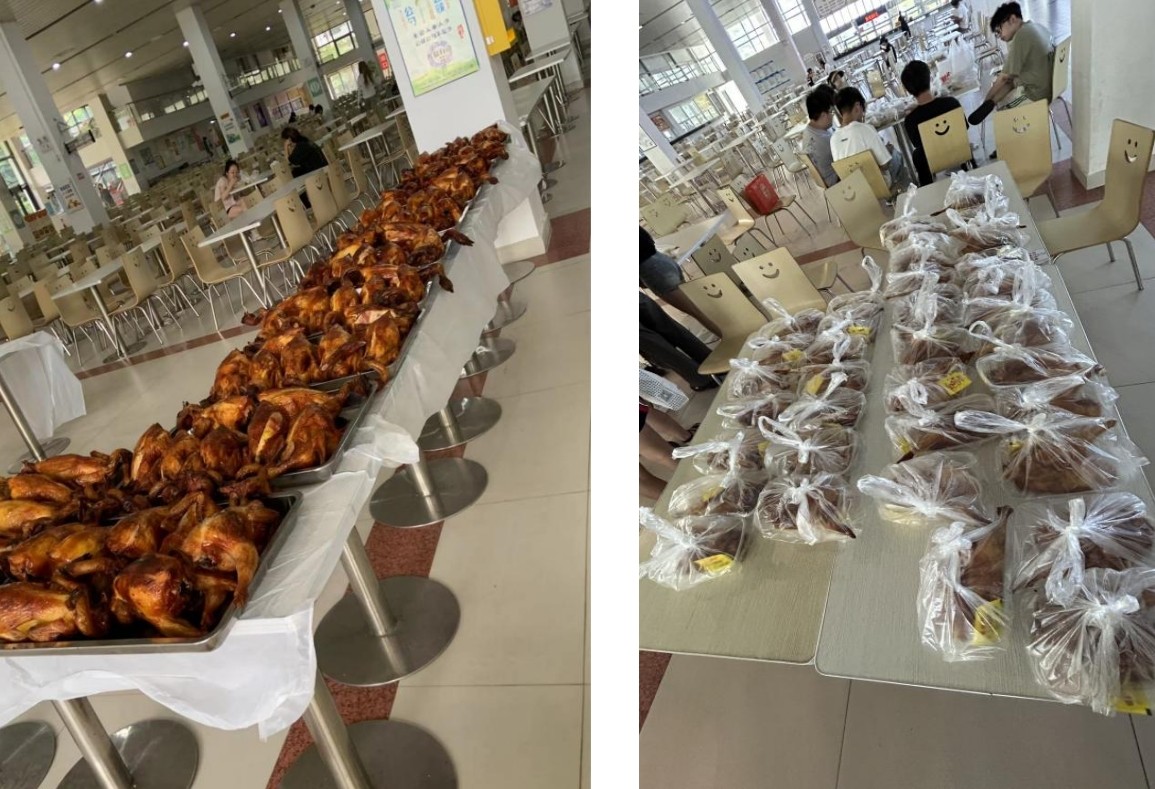 书法学院学工办教师全程组织本次活动,一只只新鲜出炉的烧鸡干净整齐地摆放在学校食堂发放台,散发着无比诱人的香气每位学生在领取队伍中都绽放出开心的笑容。我校以实际行动传递了对每一位学子的关爱,让每一位离家甚远的学生都能感受到家的温暖。