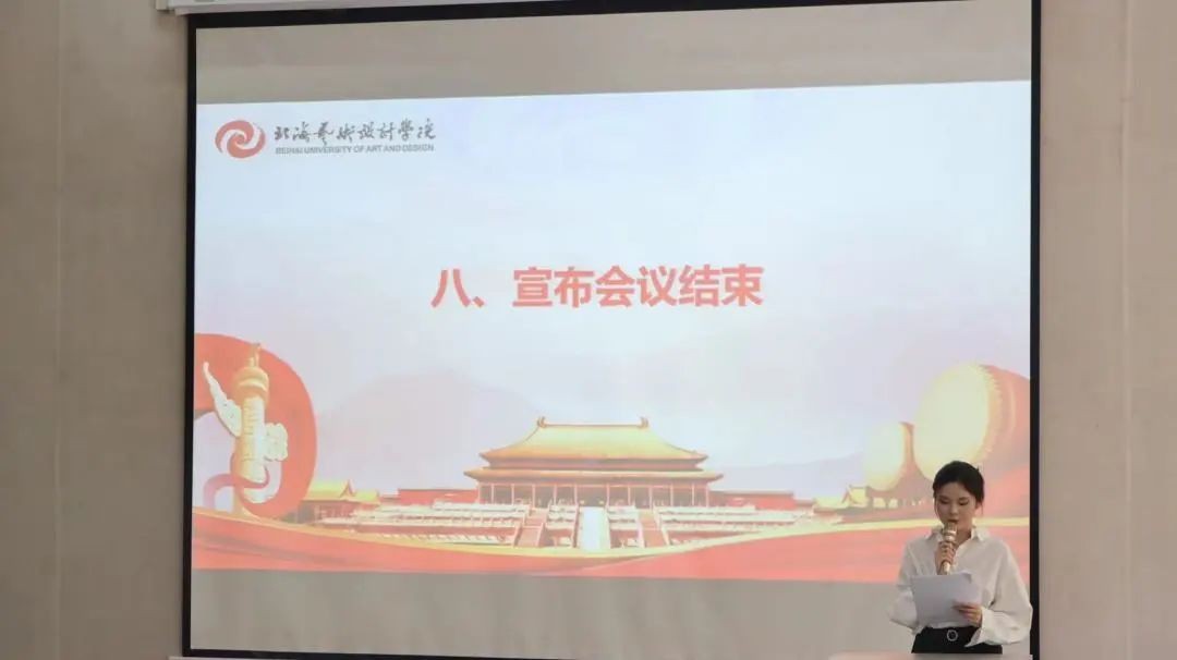 正式会议第二阶段第七项议程,宣布大会结束,参会人员全体起立,共唱《北海艺术设计学院校歌》,会议在热烈的掌声中圆满落幕。