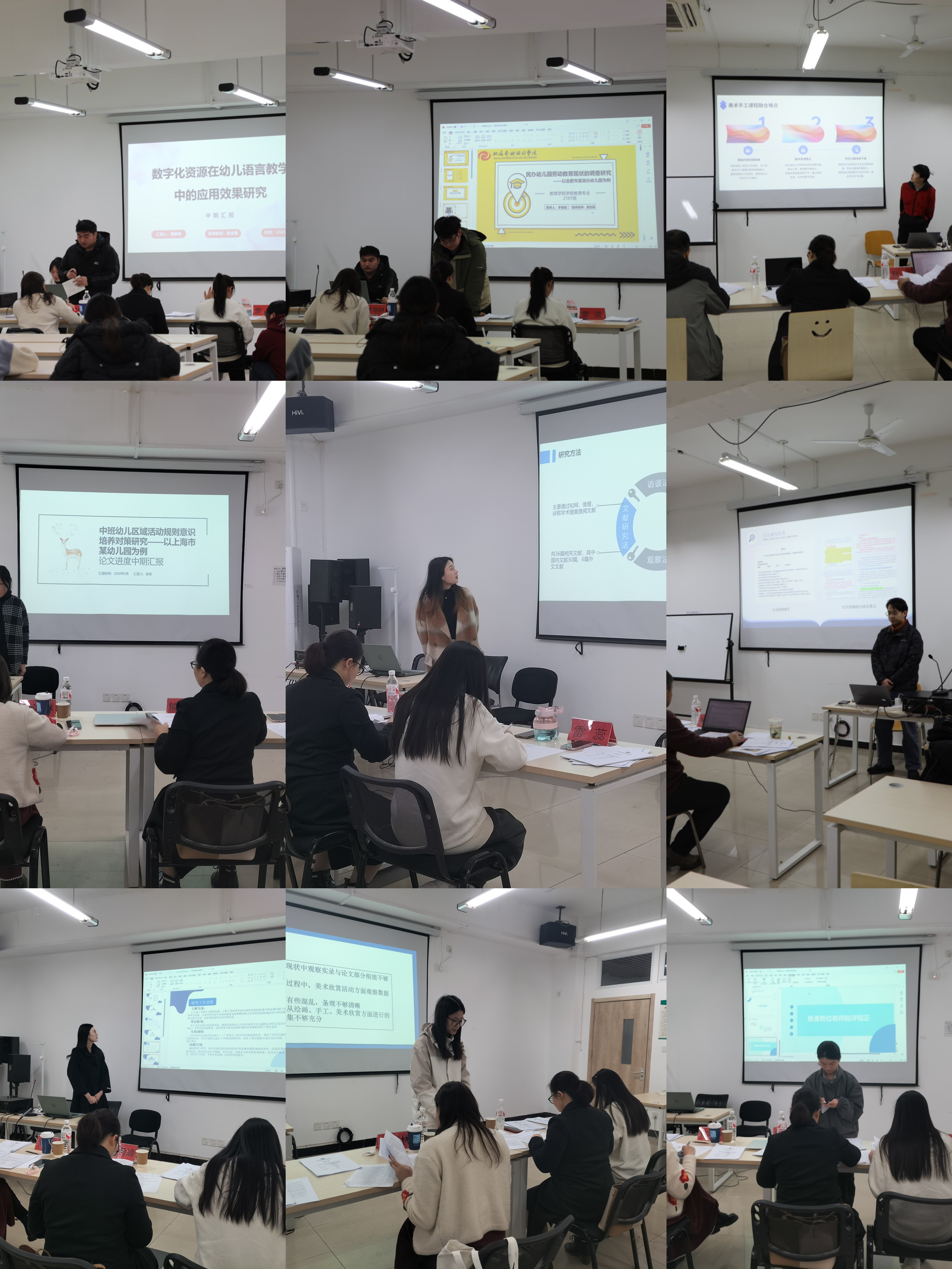 中期答辩现场,艺术教育专业和学前教育专业每一位学生分别从目前的研究进展、已完成情况、遇到的问题以及下一步的计划等方面进行汇报。他们的研究内容密切联系专业实践,深究行业中遇到的各类教育方法创新、课程设计优化、教师教育活动指导能力提升等多个领域,展现出学生们对专业领域的深入关注和积极的探索精神。