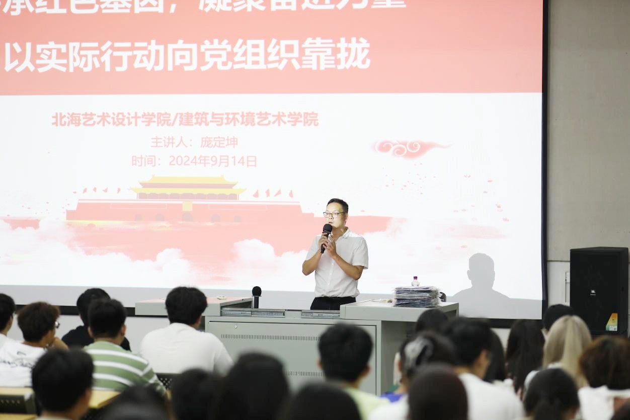 2024年9月14日下午,北海艺术设计学院建筑与环境艺术学院在西校区公德楼107教室成功举办了新生入党启蒙教育活动。此次活动以专题讲座的形式进行,主题为《传承红色基因,凝聚奋进力量》,由建筑与环境艺术学院党总支书记庞定坤主讲。共有245名新生和6位新生辅导员老师参加了此次专题学习。