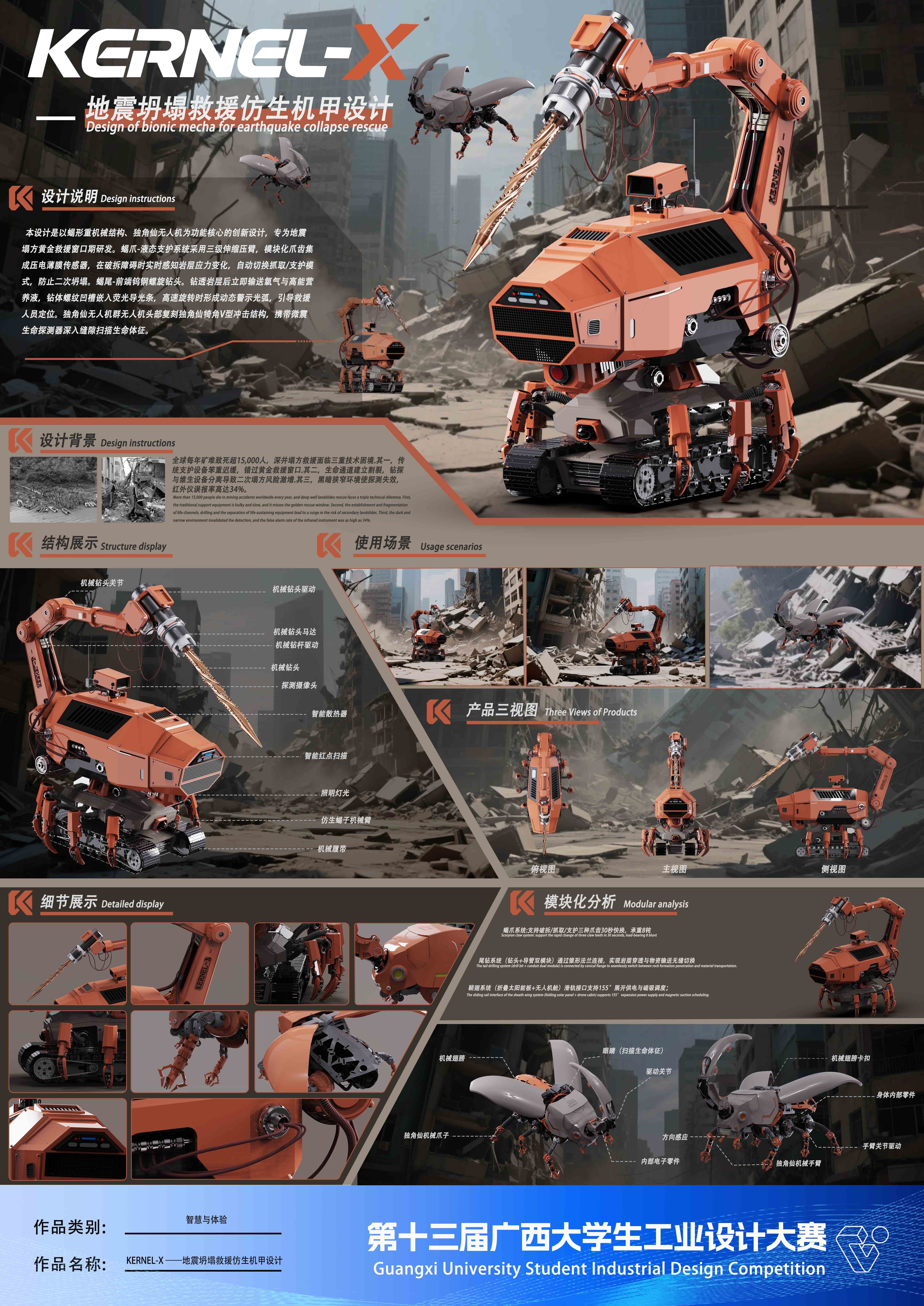 作品名称:《KERNEL-X--地震坍塌救援仿生机甲设计》