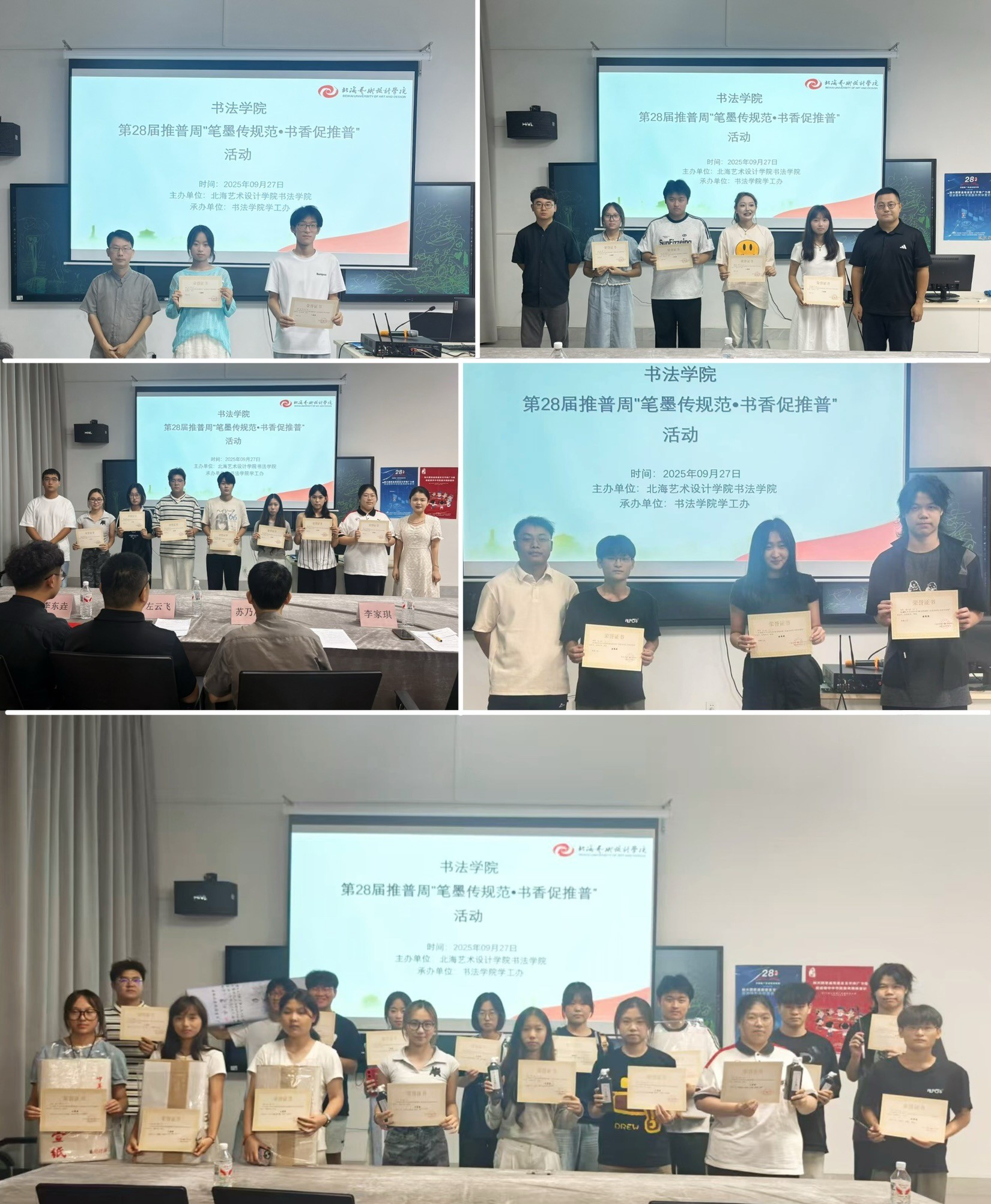 为加大国家通用语言文字推广力度,促进铸牢中华民族共同体意识,书法学院于9月19日至26日组织开展推普活动,并于9月27日在南校区艺德楼507书法教研室举办“笔墨传规范·书香促推普”宿舍规范汉字书写比赛暨推普成果展示活动。学院常务副院长苏乃从、党支部副书记左云飞,以及副院长李东垚、李家琪、黄荣婷、韦志忍共同出席并担任评审。