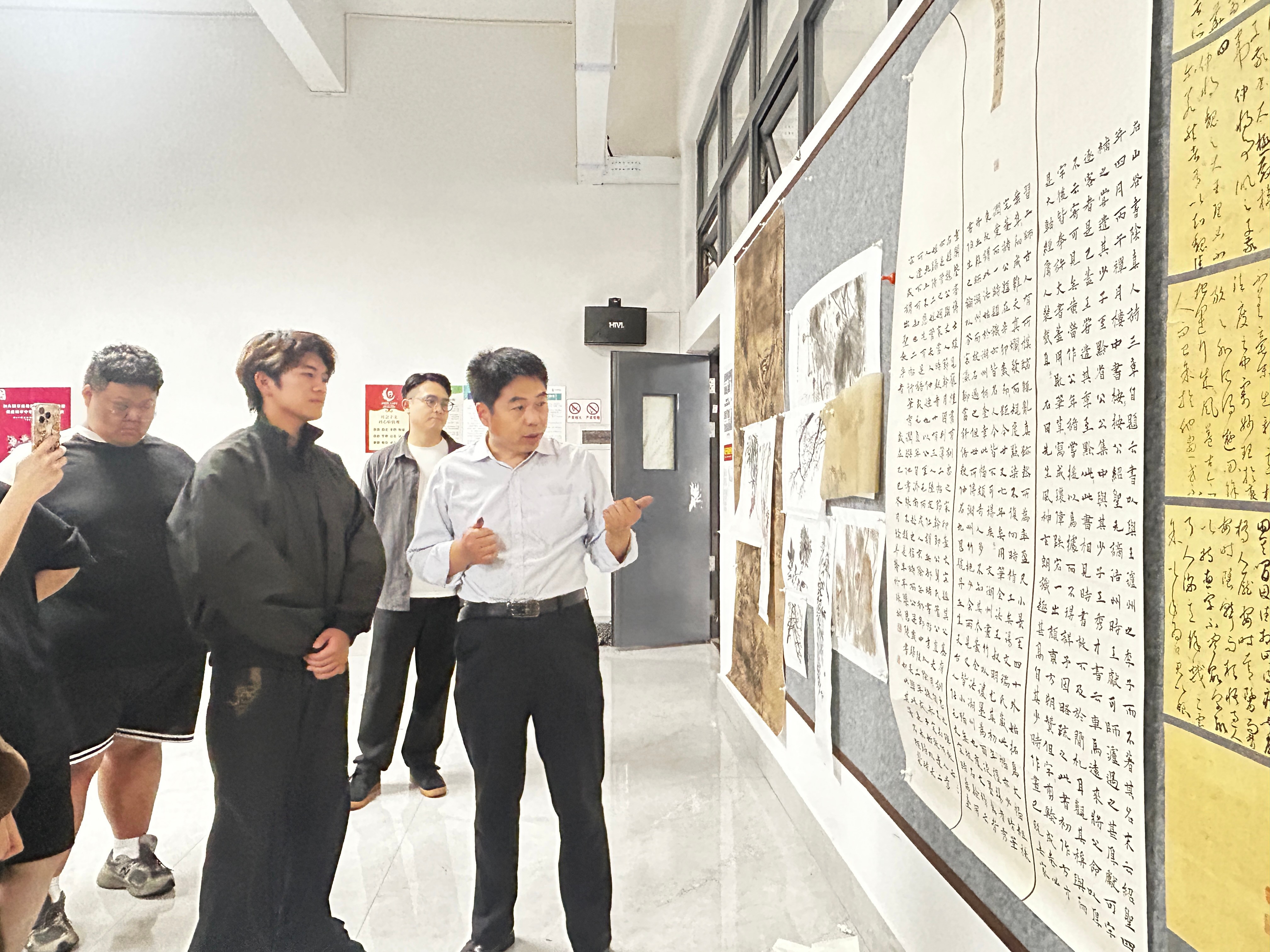 交流笔会环节中,杨小琪主席对学生习作进行细致点评,在肯定学习成果的同时,亦就形式创新与技法突破给予指导。随后,他现场挥毫,以魏碑、行书、隶书进行创作,生动展示其艺术理念与实践心得。围观师生凝神观摩、专心记录,从中汲取艺术养分。
