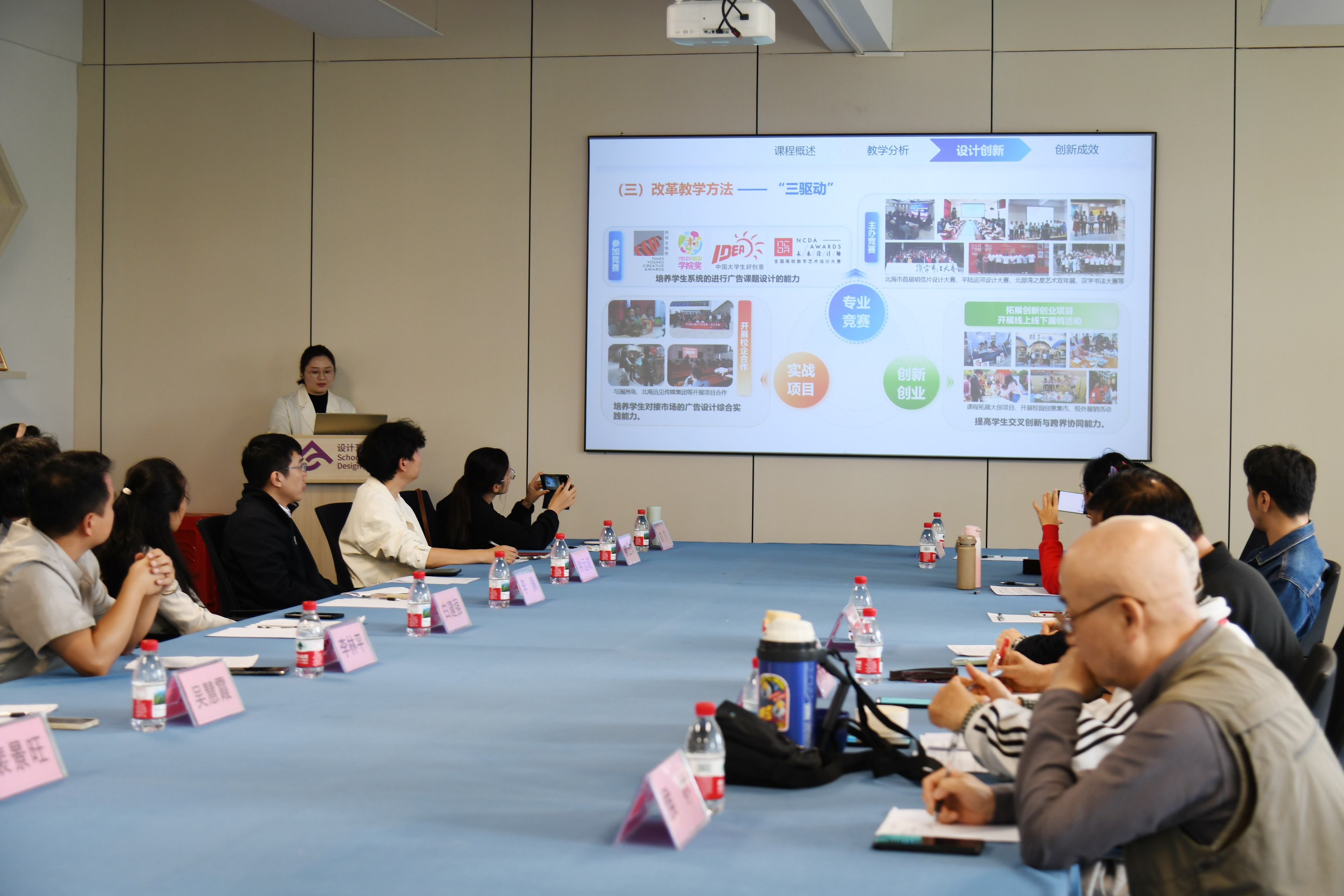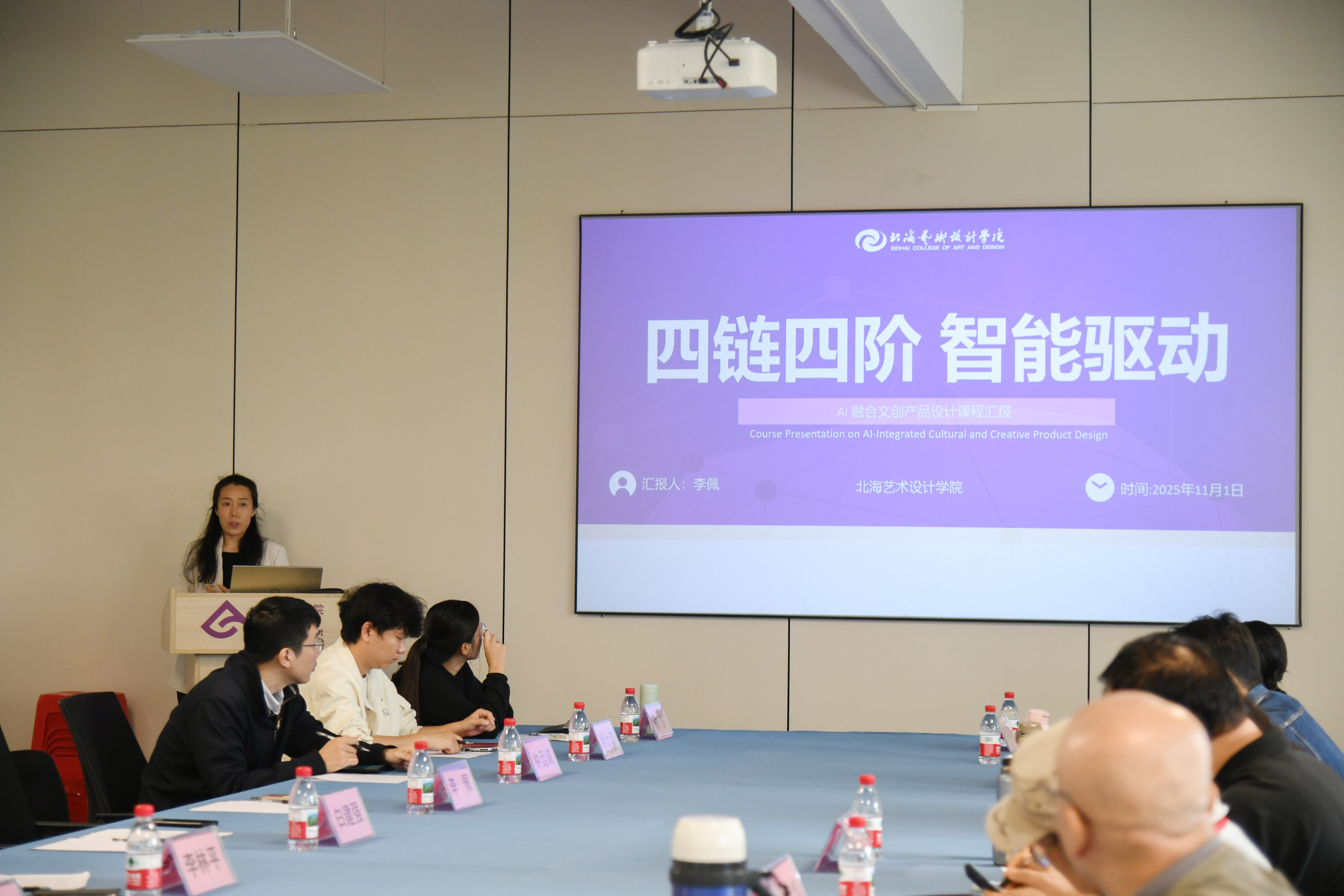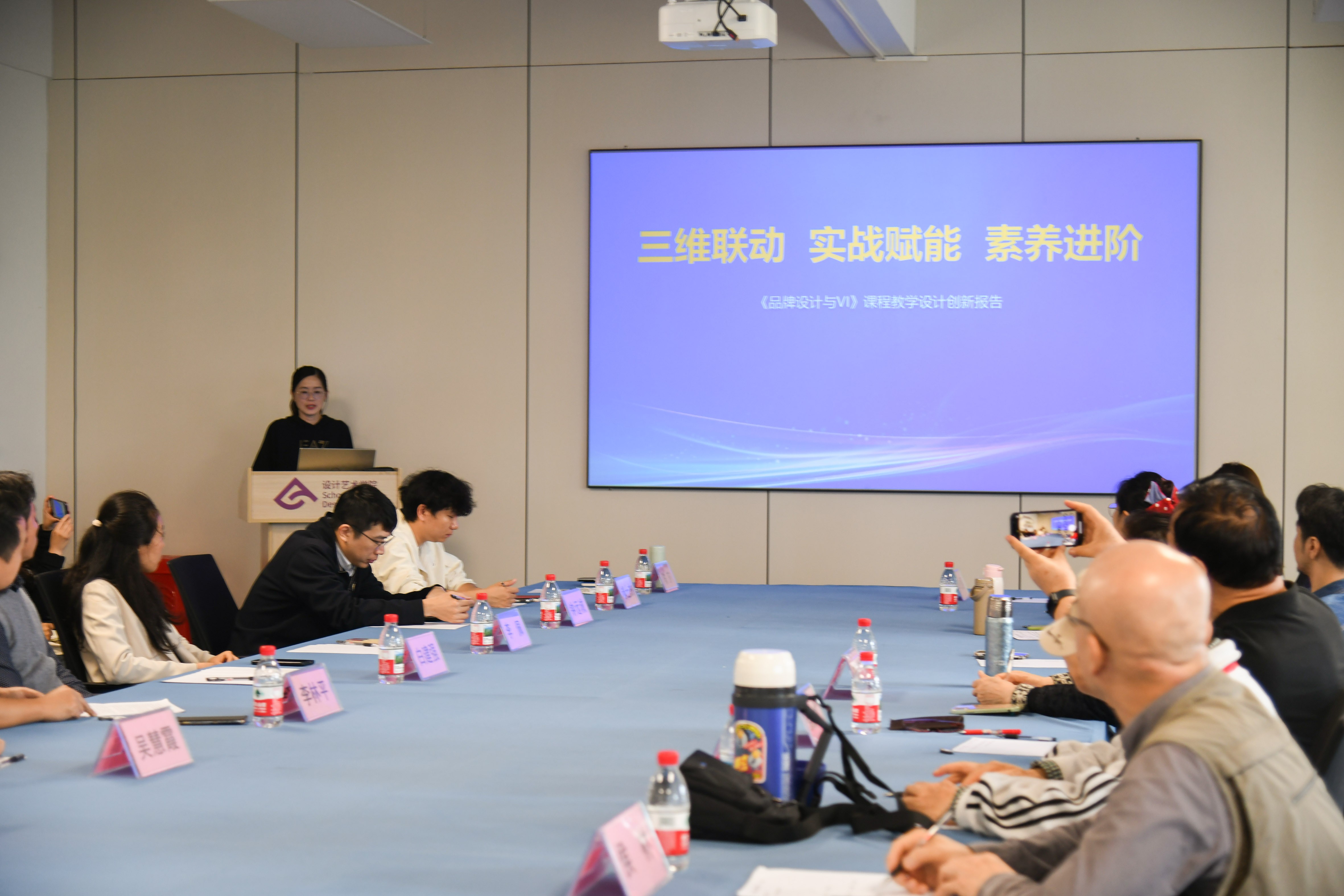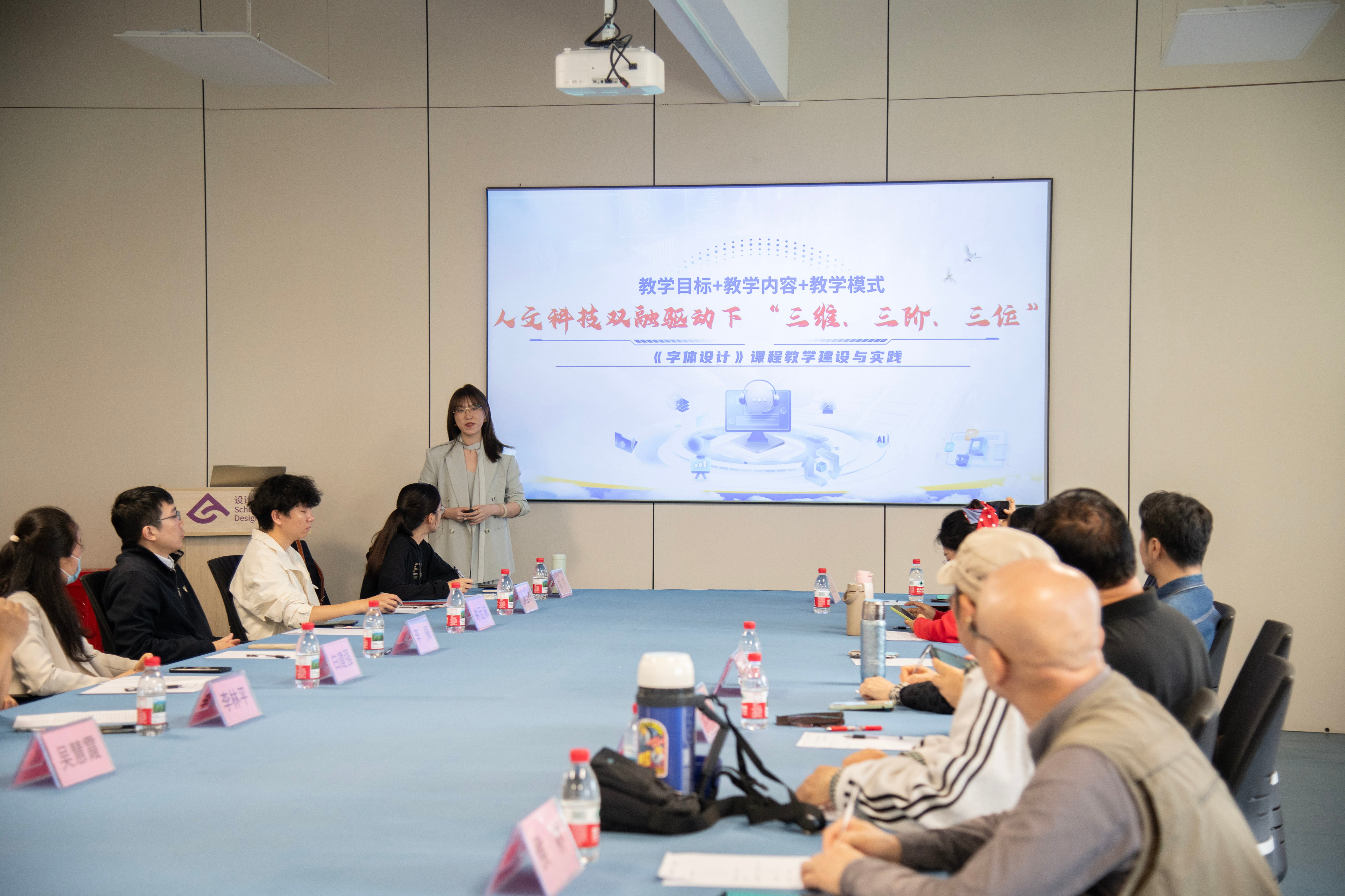 接下来由白建强副院长介绍了学院面对AI浪潮,通过强化艺科融合在专业人才培养方案设置上所做的积极调整以及课程建设上取得的成果。随后,吴慧霞副院长分享了以《一核心、二融合、三驱动、四维递进教学模式》为题,阐述了《广告设计》课程教学创新的具体举措;李佩副院长以《四链四 阶智能驱动》为题,汇报了AI如何系统性赋能《文创产品设计》课程;陈莎老师以《三维联动 实战赋能 素养进阶》为题,阐述了《品牌设计与VI》课程的教学改革思路与成果;李欣颐老师则以《人文科技双融驱动下“三维、三阶、三位“》为题,围绕《字体设计》课程介绍AI数智技术在课程各教学环节中的融合应用案例。这些汇报从不同专业角度,生动呈现了学院教师在AI教学应用前沿的积极探索。
