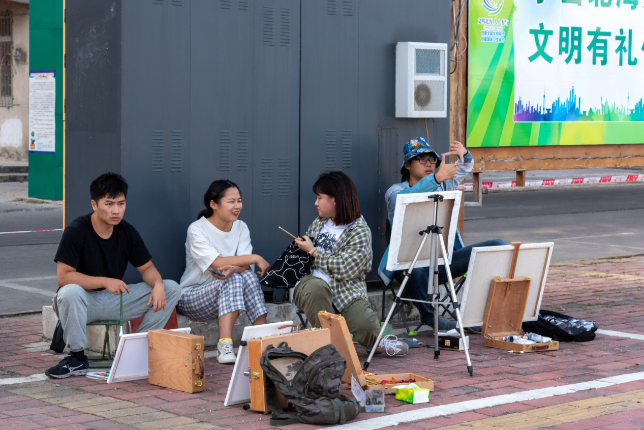 傍晚7:00,同学们收拾好了绘画工具并领取了主办方的爱心晚餐,美术学院师生在此活动中收获满满,其中还有多名学生的作品被主办方收藏;最后美术学院全体师生与文化工作者合影留念,此次助力活动在热烈的掌声中圆满结束。 (陈建江 摄)