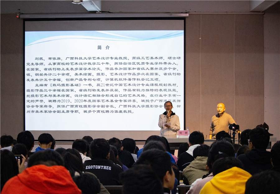 2019年12月2日晚7:30于西校区伦理楼107,广西科技大学刘凯教授为我校师生带来了一场题为《用青春的眼睛看世界——大学生摄影与关注》的精彩讲座,现场虚无坐席。本次讲座由我校副校长王斌主持。