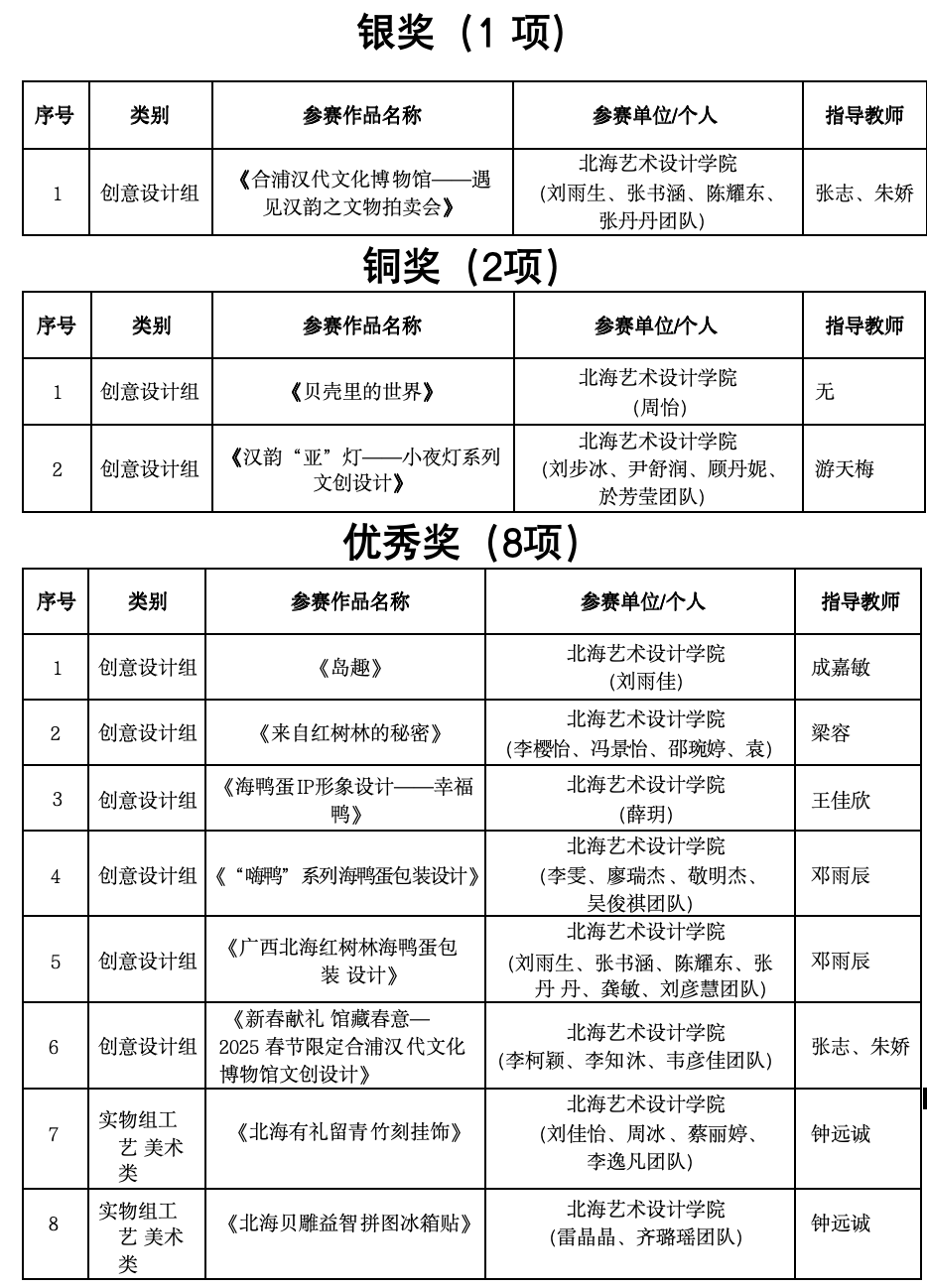 近日,由北海市旅游文体局主办、北海市非物质文化遗产保护中心和市旅游协会承办的2024年“北海有礼”特色旅游商品大赛已经圆满结束。此次大赛共收到参赛作品265套609件,分别评选出金奖1名、银奖9名、铜奖14名、优秀奖29名、优秀组织奖6名。我校设计艺术学院在此次比赛中表现突出,师生们凭借出色的创意和扎实的设计功底,荣获银奖1项、铜奖1项、优秀奖8项。同时,我校因出色的组织工作荣获优秀组织奖1项。