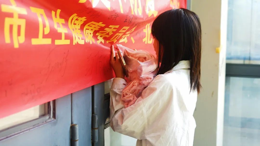 在青志协志愿者的号召下,同学们积极响应,纷纷在横幅上写下自己的名字,以这种特殊且新颖的方式让同学们一起参与到防艾活动中来。