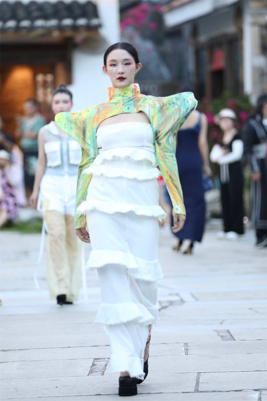 北艺学子在时装秀中快乐自在的状态,展现出了更加自信的美好品质,也展示了学生学习成果。同学们用纷呈各异的艺术设计表现手法,展示出对服装艺术的理解和追求,整个服装作品精彩的走秀展演伴着动听的音乐不断地给海丝首港景区游客带来惊喜和震撼,现场阵阵掌声为同学们的创意喝彩。