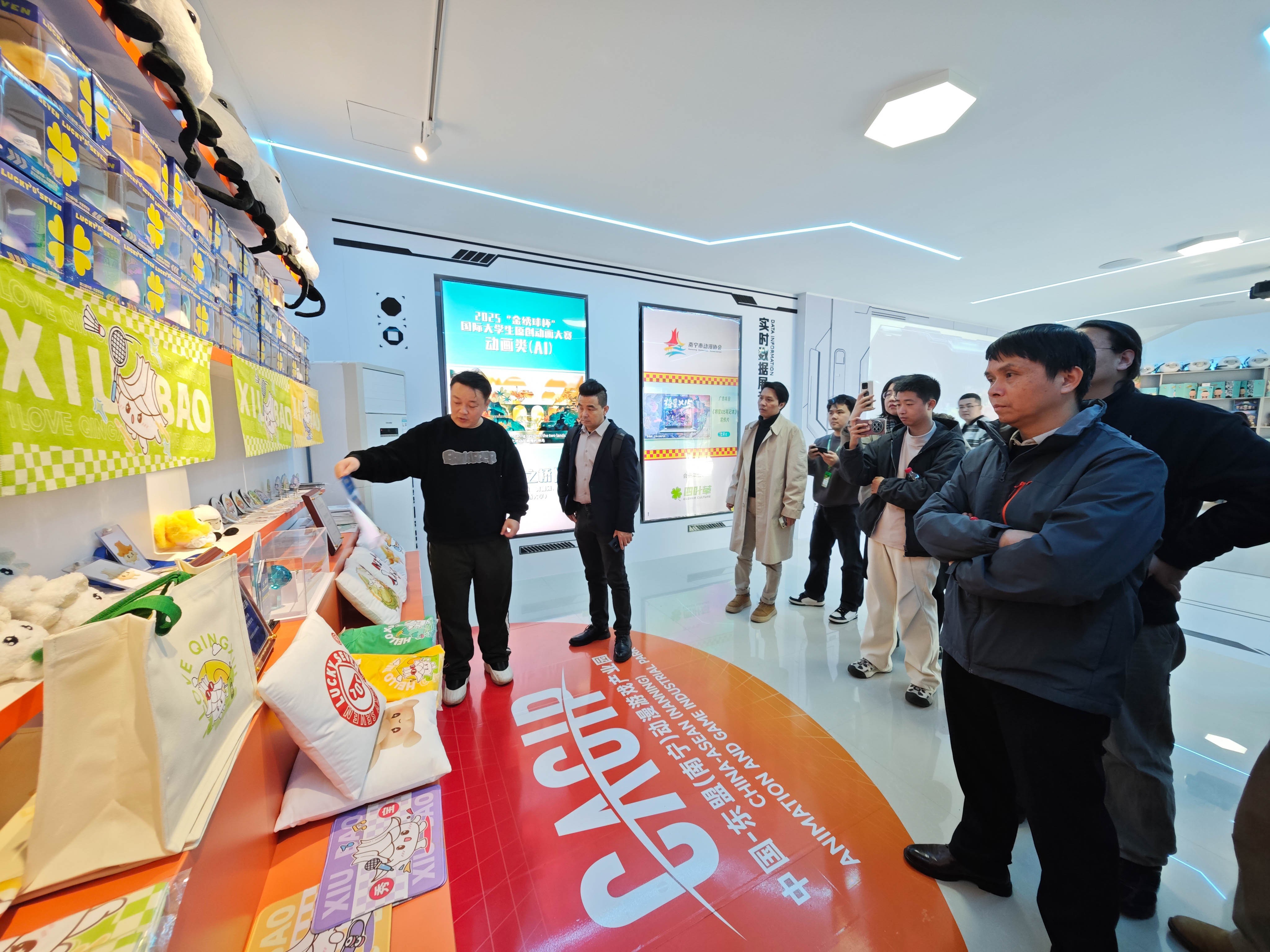 随后,调研团队赴广西四叶草文化传媒公司参观交流,该企业负责人热情接待并详细介绍相关情况,介绍了公司以打造广西动漫产业园区为核心目标,阐述了以南宁凤岭儿童公园为载体的运营构想,重点分享了以本土特色形象“白头叶猴”为核心的动漫IP开发与运营实践案例。该公司立足地方文化资源深耕产业化开发的思路,为我校影视动画学院优化专业教学体系、丰富创作实践方向提供了全新视角,也为后续校企探索文化IP共建等合作奠定了基础。